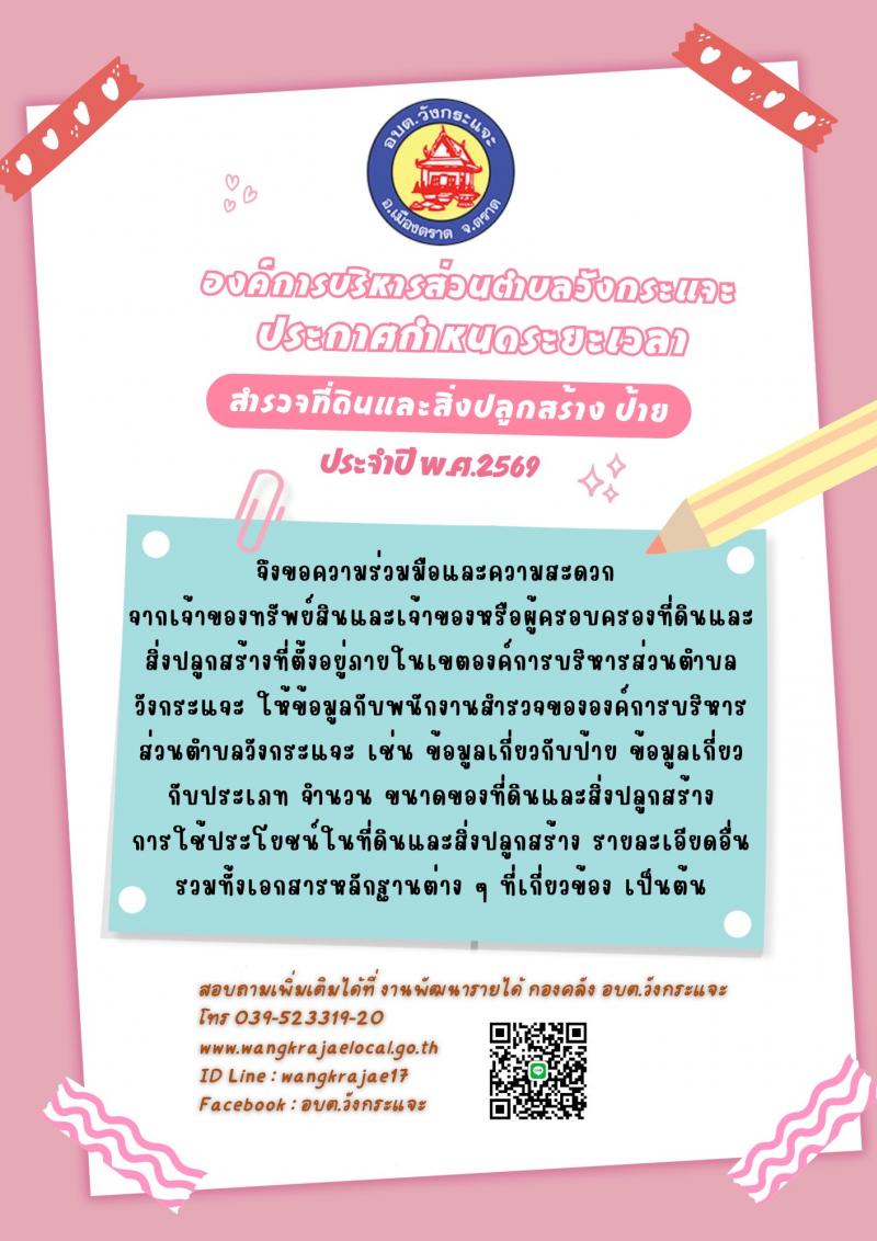 ประกาศองค์การบริหารส่วนตำบลวังกระแจะ เรื่อง กำหนดระยะเวลาสำรวจข้อมูลทรัพย์สินเพื่อใช้ในการประเมินภาษีป้าย และสำรวจที่ดินและสิ่งปลูกสร้าง (เพิ่มเติม) ประจำปี พ.ศ.2569