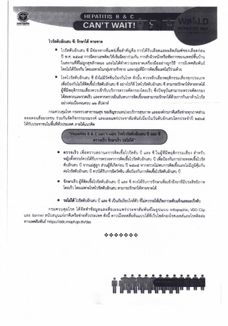 ประชาสัมพันธ์ การรณรงค์วันตับอักเสบโลกประจำปี ๒๕๖๕ ตามแนวคิด “Hepatitis B&C can’t wait : โรคไวรัสตับอักเสบ บี และ ซี ตรวจเร็ว รักษาเร็ว รอไม่ได้”