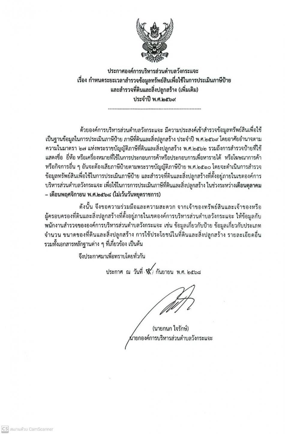 ประกาศองค์การบริหารส่วนตำบลวังกระแจะ เรื่อง กำหนดระยะเวลาสำรวจข้อมูลทรัพย์สินเพื่อใช้ในการประเมินภาษีป้าย และสำรวจที่ดินและสิ่งปลูกสร้าง (เพิ่มเติม) ประจำปี พ.ศ.2569 [19 กันยายน 2568]