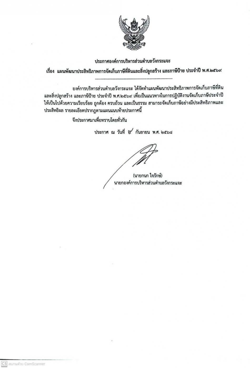 ประกาศองค์การบริหารส่วนตำบลวังกระแจะ เรื่อง แผนพัฒนาประสิทธิภาพการจัดเก็บภาษีที่ดินและสิ่งปลูกสร้าง และภาษีป้าย ประจำปี พ.ศ.2569 [19 กันยายน 2568]