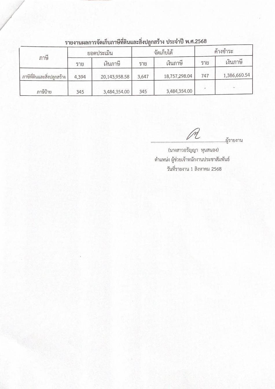 รายงานผลการจัดเก็บภาษีที่ดินและสิ่งปลูกสร้าง อบต.วังกระแจะ ประจำปี พ.ศ.2568 [3 ตุลาคม 2568]