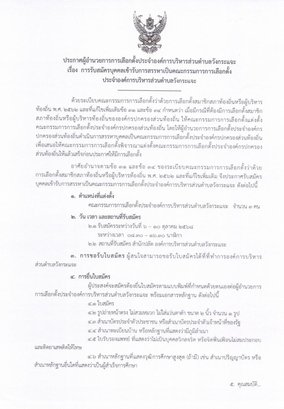 ประกาศผู้อำนวยการการเลือกตั้งประจำองค์การบริหารส่วนตำบลวังกระแจะ เรื่อง การรับสมัครบุคคลเข้ารับการสรรหาเป็นคณะกรรมการการเลือกตั้ง ประจำองค์การบริหารส่วนตำบลวังกระแจะ [1 ตุลาคม 2568]