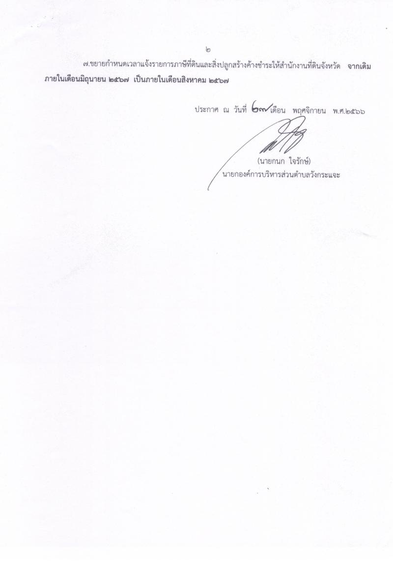 ประกาศองค์การบริหารส่วนตำบลวังกระแจะ เรื่อง ขยายกำหนดเวลาดำเนินการตามพระราชบัญญัติภาษีที่ดินและสิ่งปลูกสร้าง พ.ศ.2562 ประจำปี พ.ศ.2567