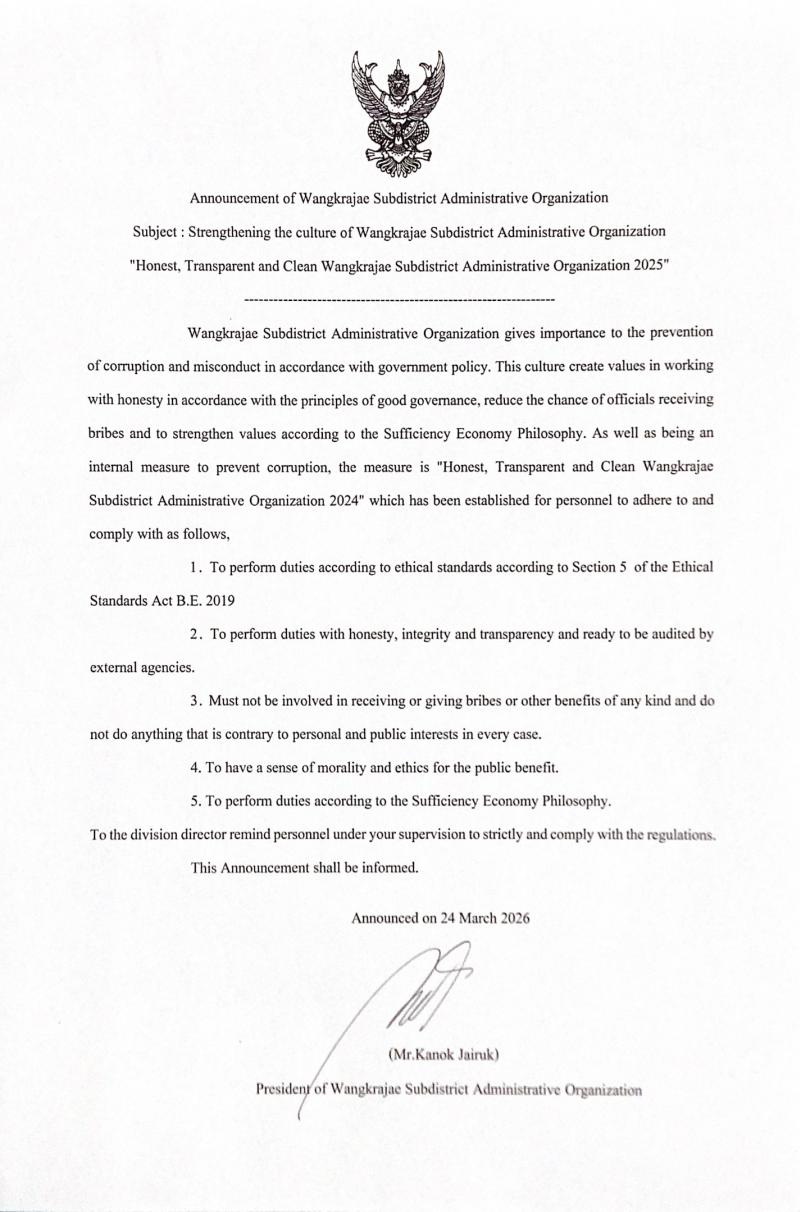 ประกาศองค์การบริหารส่วนตำบลวังกระแจะเรื่อง การเสริมสร้างวัฒนธรรมองค์การบริหารส่วนตำบลวังกระแจะ "สุจริต โปร่งใส องค์การบริหารส่วนตำบลวังกระแจะใสสะอาด๒๕๖๙"