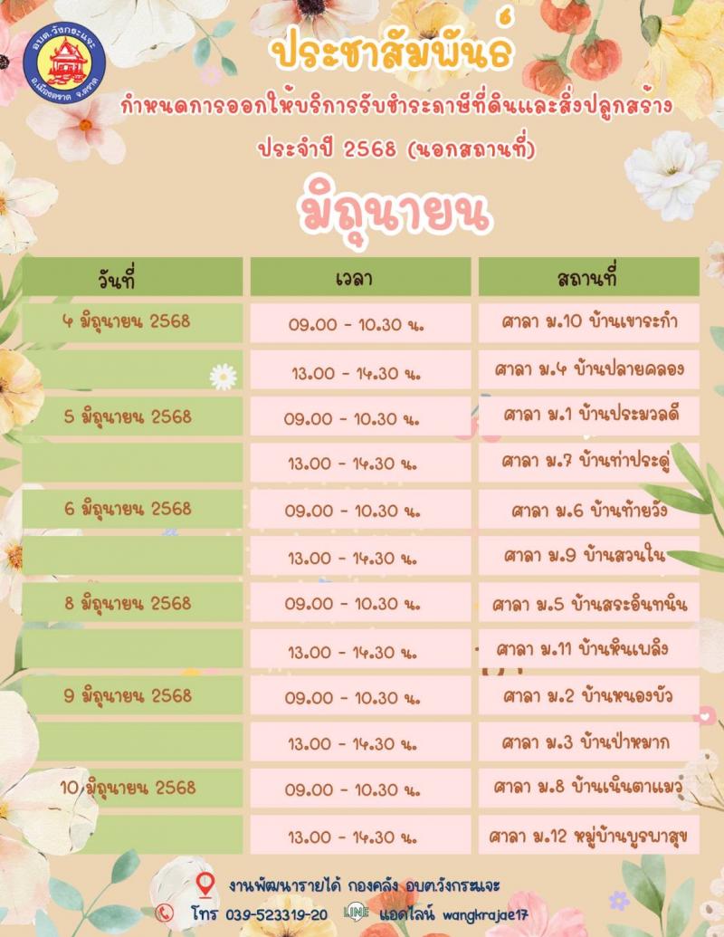 ประชาสัมพันธ์จากงานพัฒนารายได้ กองคลัง องค์การบริหารส่วนตำบลวังกระแจะ เดือนมิถุนายน 2568 เป็นเดือนสุดท้ายของการชำระภาษีที่ดินและสิ่งปลูกสร้าง โดยสามารถติดต่อชำระได้ ณ งานพัฒนารายได้ กองคลัง องค์การบริหารส่วนตำบลวังกระแจะ หรือ ณ ศาลาหมู่บ้านในวันประชุม