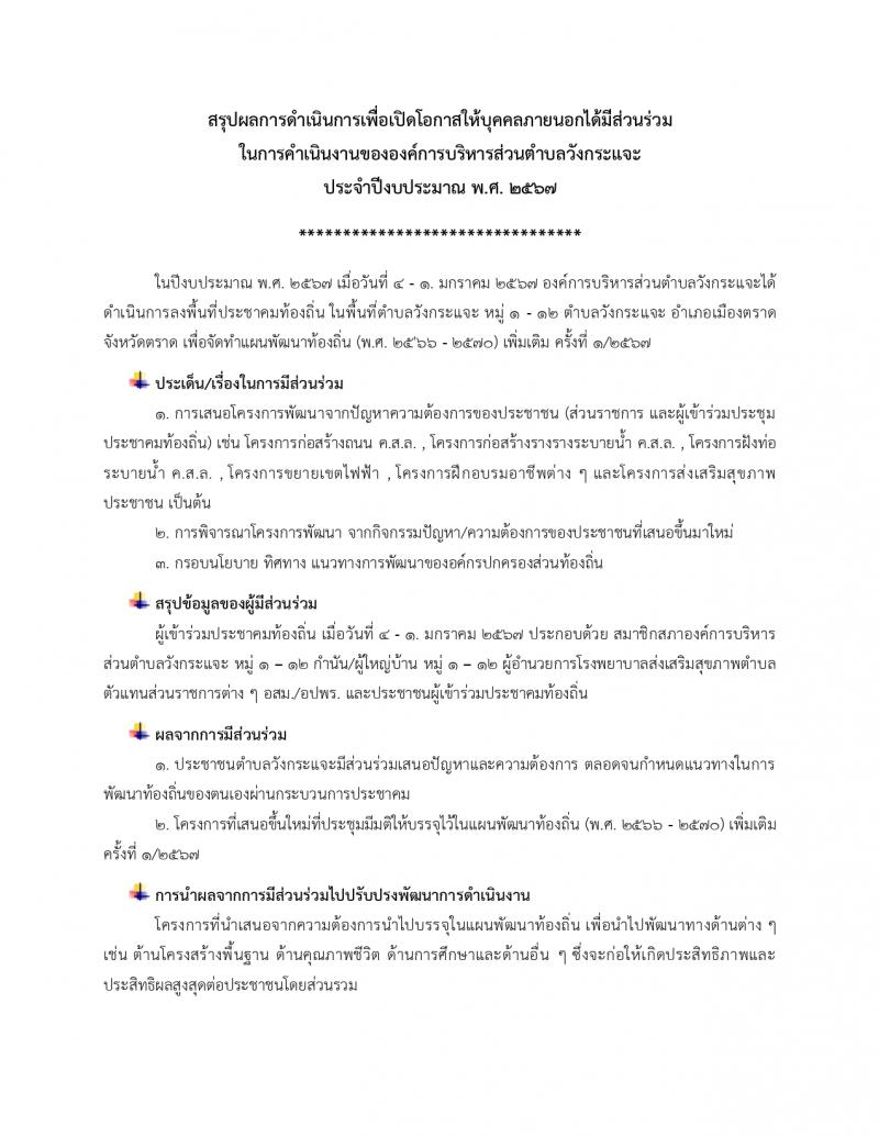 การมีส่วนร่วมของบุคคลภายนอกผ่านการประชาคมหมู่บ้าน ระหว่างวันที่ 4 - 10 มกราคม 2567