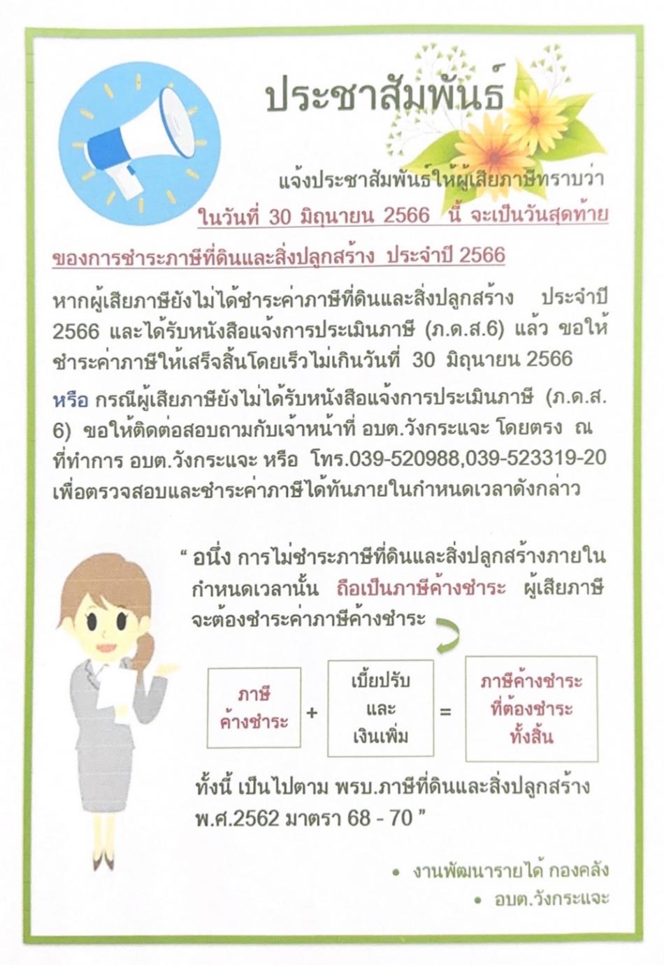 องค์การบริหารส่วนตำบลวังกระแจะ ขอแจ้งประชาสัมพันธ์ กำหนดการชำระภาษีที่ดินและสิ่งปลูกสร้าง ประจำปี 2566 [8 มิถุนายน 2566]
