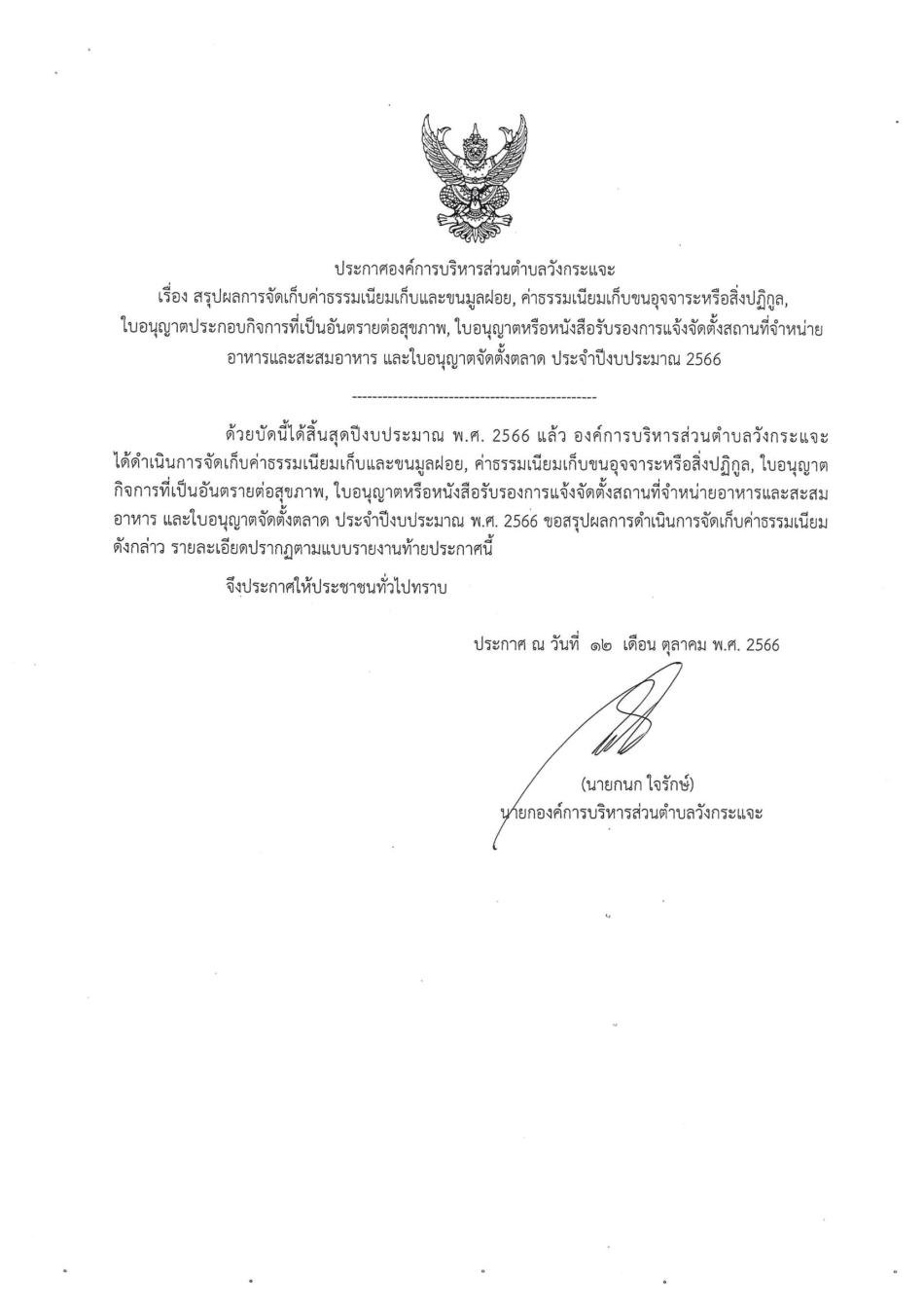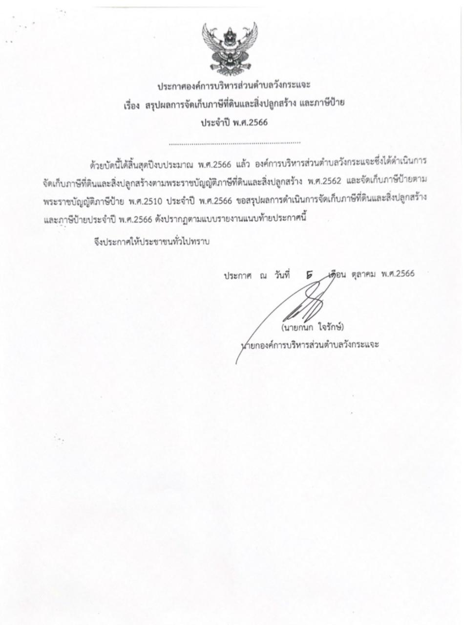 ประกาศองค์การบริหารส่วนตำบลวังกระแจะ เรื่อง สรุปผลการจัดเก็บภาษีที่ดินและสิ่งปลูกสร้าง และภาษีป้าย ประจำปี พ.ศ. ๒๕๖๖ [5 ตุลาคม 2566]