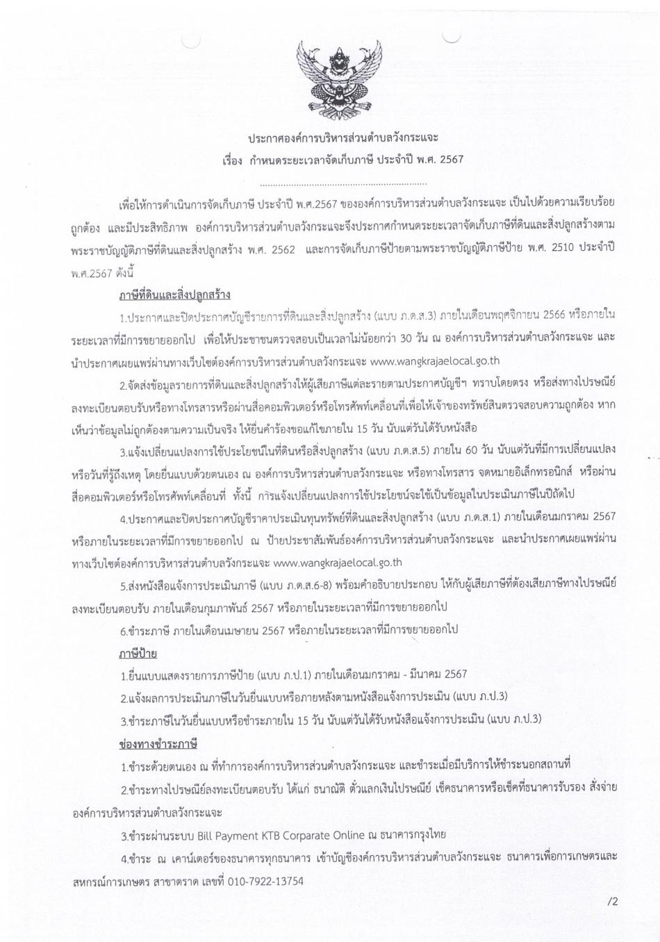 ประกาศองค์การบริหารส่วนตำบลวังกระแจะ เรื่อง กำหนดระยะเวลาจัดเก็บภาษี ประจำปี พ.ศ.2567 [11 ตุลาคม 2566]