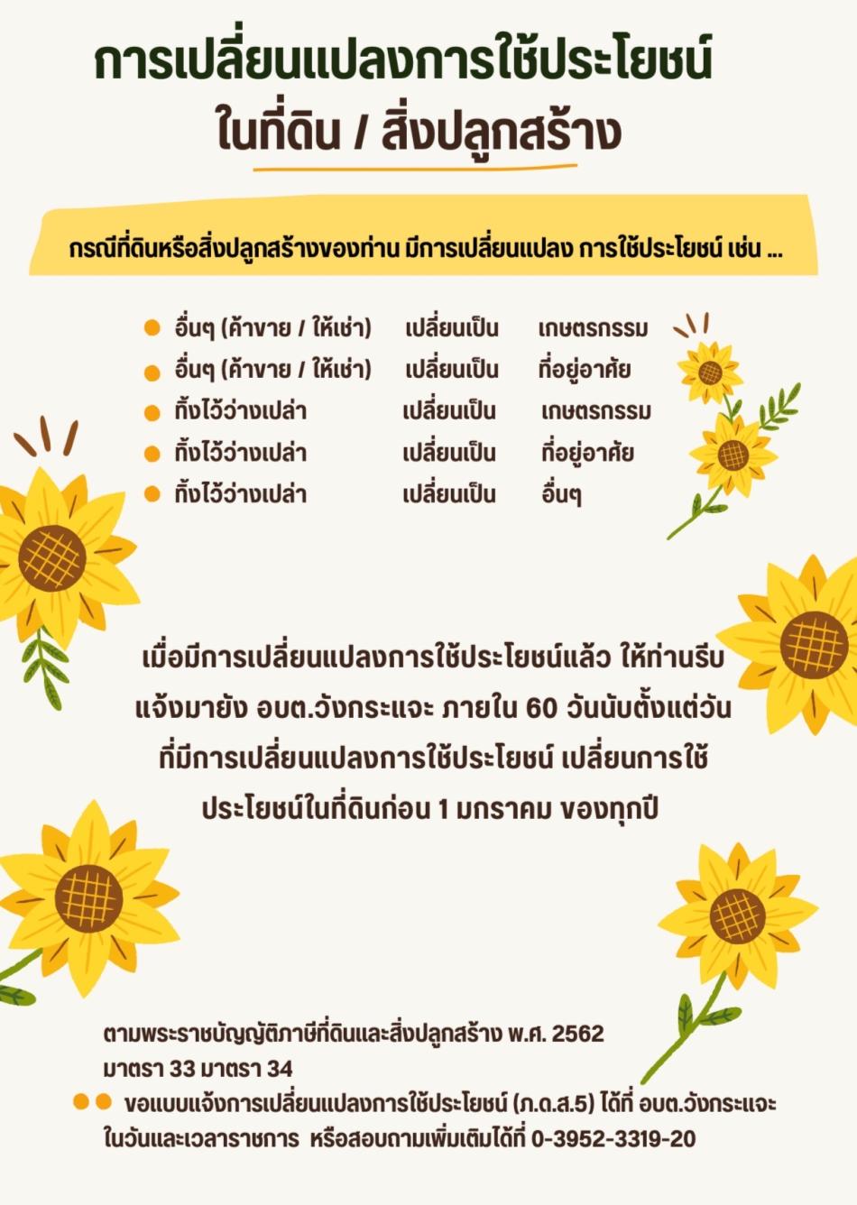 ข่าวประชาสัมพันธ์ กรณีที่ดินหรือสิ่งปลูกสร้างของท่านมีการเปลี่ยนแปลงการใช้ประโยชน์ เมื่อมีการเปลี่ยนแปลงการใช้ประโยชน์แล้ว ให้ท่านรีบแจ้งมายัง องค์การบริหารส่วนตำบลวังกระแจะ ภายใน 60 วัน... [13 พฤศจิกายน 2566]