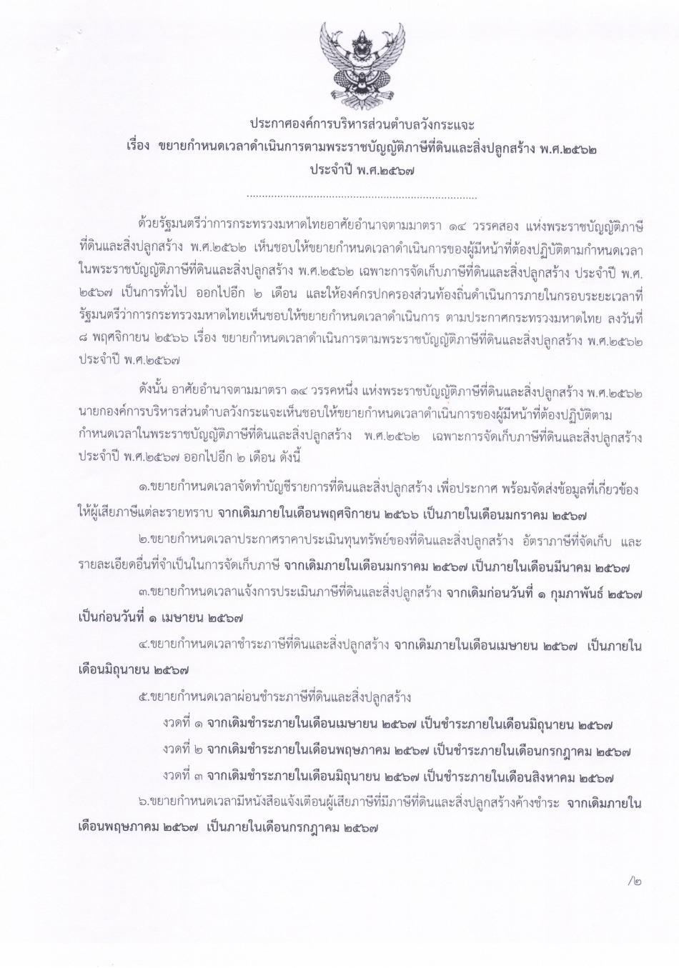 ประกาศองค์การบริหารส่วนตำบลวังกระแจะ เรื่อง ขยายกำหนดเวลาดำเนินการตามพระราชบัญญัติภาษีที่ดินและสิ่งปลูกสร้าง พ.ศ.2562 ประจำปี พ.ศ.2567 [28 พฤศจิกายน 2566]